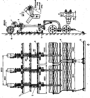 К каждому культиватору УСМК-5.4В или КРД-5,4 для закрытия влаги прилагается пять комплектов трехбрусных шарнирных шлейфов, из них два комплекта укороченных и три удлиненных. Укороченные трехбрусные шарнирные шлейфы устанавливают по краям культиватора, а удлиненные трехбрусные шлейфы - в середине культиватора, т. е. между укороченными (рис. 3.2).
