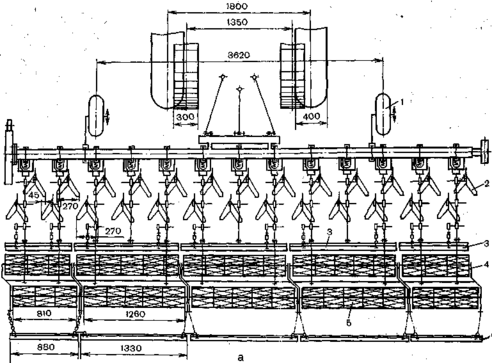 Рисунок 3.3 - Схема расстановки рабочих органов (а) и установки их на грядилях (б) культиваторов КРД-5,4 и УСМК-5,4В для предпосевной обработки почвы нормальной влажности под посев кормовой свеклы: