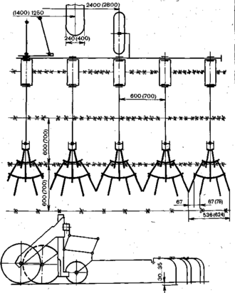 Для прореживания посевов кормовой свеклы с междурядьями 60 или 70 см применяют односторонние лапы захватом 85 мм, образующие нарезанные букеты длиной 115 мм при междурядьях 60 см и длиной 148 мм при междурядьях 70 см. Одновременно с нарезкой букетов проводят сплошную обработку свекловичного поля 6-дисковыми ротационными батареями, установленными в два ряда для разрыхления почвы в нарезанных букетах, и смещение со своего места подрезанных растений свеклы и сорняков.