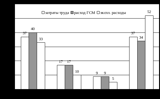 Из рисунка в частности видно, что самой ресурсозатратной группой механизированных работ для озимой пшеницы является уборка. Эксплуатационные затраты на 52% своего суммарного размера формируются именно в этой группе работ. Наибольшая доля расхода ГСМ приходится на группу операций по обработке почвы. Это происходит из-за вспашки на глубину 25-27 см с оборотом пласта, что является очень энергоемкой операцией.