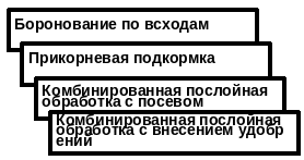 При обработке почвы под посев яровых после пропашных культур вместо двухследного дискования, отвальной вспашки и весенней культивации с поверхностным внесением минеральных удобрений в новой технологии сразу после уборки предшественника проводится комбинированная послойная обработка на глубину 10-12 см с одновременным внутрипочвенным внесением удобрений. После отрастания сорняков выполняется глубокое послойное рыхление с использованием комбинированных агрегатов типа КАО или УНС конструкции ВНИПТИМЭСХ, которые позволяют увеличить глубину обработанного слоя до агротехнически требуемой (20-22 см), уничтожить проросшие сорняки, выровнять и подуплотнить обработанный горизонт и замульчировать поверхность поля. В этом случае в зиму поле уходит в состоянии «компактной вспашки», способной максимально накопить влагу, и весной практически не требует дополнительных обработок.