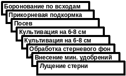 Традиционная технология подготовки почвы под посев пропашных культур включает в свой состав 9 различных операций (двукратное лущение стерни после уборки предшественника, поверхностное внесение минеральных удобрений, глубокую отвальную вспашку, весеннее боронование, две культивации, выравнивание, предпосевное внесение гербицидов).