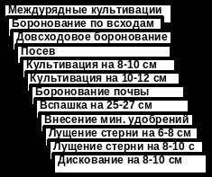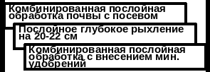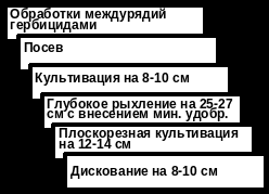 В новой технологии предусмотрено лущение стерневого фона на глубину 6-8 см, послойная комбинированная обработка с внутрипочвенным внесением минеральных или концентрированных органических удобрений. По мере отрастания сорняков выполняется глубокое послойное рыхление на глубину до 27 см с одновременным дроблением глыб, выравниванием, подуплотнением и мульчированием обработанной поверхности поля. Весной проводят одну или (при необходимости) две комбинированные обработки с использованием агрегатов типа КУМ с одновременным внесением и заделкой гербицидов.