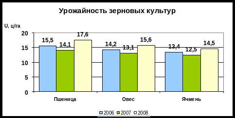 Из диаграммы мы видим, что урожайность яровых зерновых не постоянная и колеблется каждый год, сказываются почвенно-климатические условия, так как хозяйство находится в зоне рискованного земледелия, где часто встречаются такие явления как засуха, сильные ветры, затяжные дожди. Но в последние годы урожайность уверенно ползет вверх. Это зависит от умелой и научно организованной работы механизаторов и инженерного персонала. Применение передовых технологий и внедрение прогрессивной организации труда.