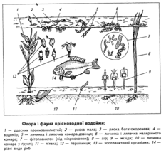 До поширених і найбільш розвинених у водоймах належать водорості з груп діатомових, зелених, синьозелених. Менше значення мають лірофітові, евгленові, золотисті, жовтозелені водорості. [5,17]