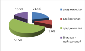 По результатам агрохимического обследования установлено, что 53,5 % площади почв хозяйства имеют среднекислую реакцию (рН=4,6-5,0), 21,4 % сильнокислую (рН4,1-5,4), 15,5 % близкую к нейтральной (рН=5,6-6,0), 9,6% слабокислую (рН=5,1-5,5).