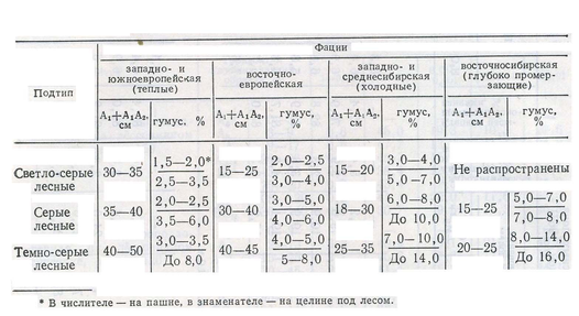 Темно-серые лесные почвы по своим признакам и свойствам близки к черноземам оподзоленным. Содержание гумуса составляет 3,5–4% в западных фациях и 8–9% в восточных, вниз по профилю уменьшается постепенно. ГК преобладают над ФК (Сгк:Сфк>1). Содержание азота составляет 0,2–0,4%. Емкость поглощения изменяется от 15–20 до 35–45 м.-экв/100 г почвы, степень насыщенности основаниями высокая (80–90%). Реакция среды слабокислая. Гидролитическая кислотность в типе серых лесных почв обычно составляет 2–5 мг-экв/100 г почвы.