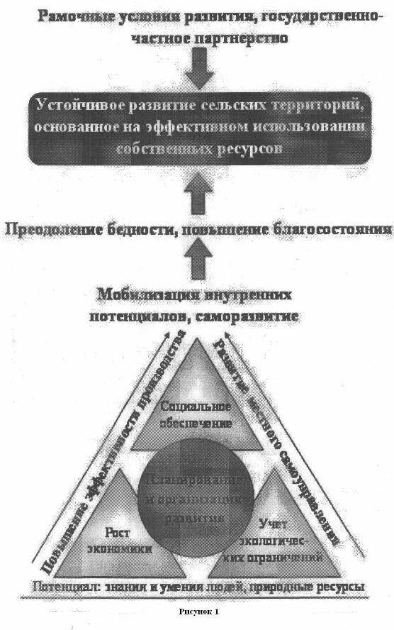 В общем виде процесс перехода к устойчивому развитию сельских территорий показан на рисунке 1. В нижней части схемы представлены три основные сферы человеческой деятельности в сельской местности: экономическая, социальная и экологическая. На основе использования специальных инструментов развития сельских территорий происходит мобилизация человеческого и экономического потенциала саморазвития сельских территорий. В конечном итоге это будет способствовать преодолению сельской бедности и повышению благосостояния населения, являющихся непременным условием перехода к устойчивому развитию, основанном на использовании собственных ресурсов.