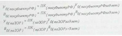 Определяется расчетная валовая продукция с 1 га сельскохозяйственных угодий в рублях и в ц. к.ед. в среднем за 1971-1999 гг. по земельно-оценочным районам и в целом по субъекту РФ умножением соответствующих показателей п. 5.7.6. на поправочные коэффициенты, полученные в соответствии с п. 7.1.7.