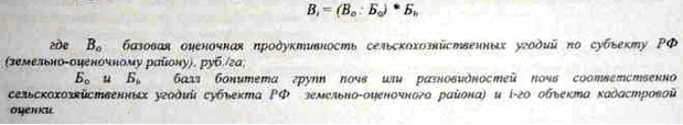 Валовая продукция объекта государственной кадастровой оценки (В1) определяется путем дифференциации базовой оценочной продуктивности сельскохозяйственных угодий по субъекту РФ (земельно-оценочному району) пропорционально баллам бонитета почв объекта кадастровой оценки по формуле: