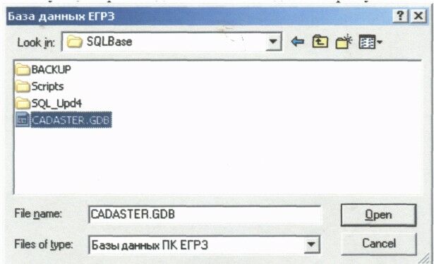 В данном диалоге необходимо указать путь к базе данных ПК ЕГРЗ (CADASTER.GDB) и нажать кнопку