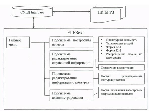 • Подсистема редактирования информации о контурах - получает информацию о землевладельцах и землепользователях в пределах доступных для текущего пользователя кадастровых кварталов. Для полученных землевладельцев и землепользователей из базы данных ПК ЕГРЗ начитывается информация о земельных участках для которых редактируются контура.