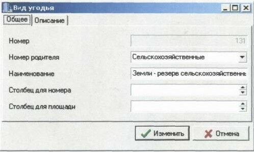 • Виды угодий - вызывает окно редактирования видов угодий . Угодья - вызывает окно редактирования контуров участков