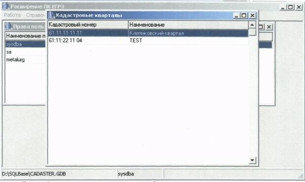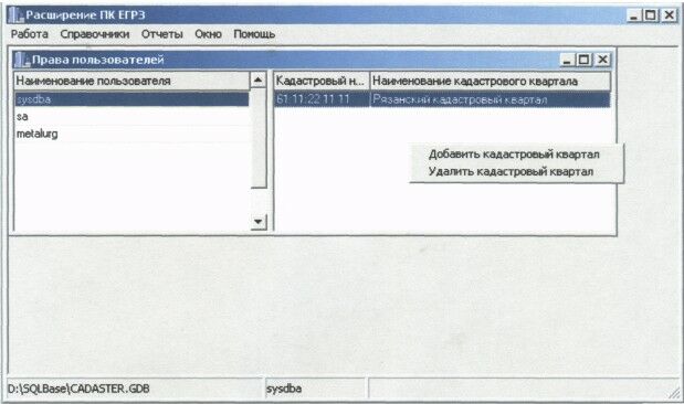 Раздавать права в модуле ЕГРЗехt может только пользователь sisdba. Для раздельной работы с информацией каждому пользователю задаются кадастровые кварталы, с которыми он может работать. Для данных кадастровых кварталов пользователю доступны все операции (добавление и удаление контуров, получение отчетной информации и т.д.).