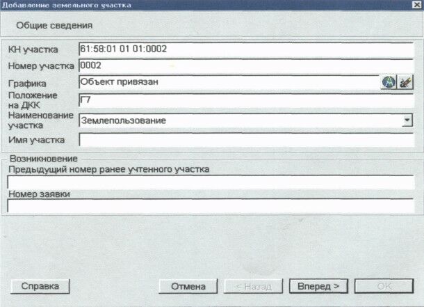 Поле Предыдущий номер ранее учтенного участка. Это поле должно быть заполнено только для ранее учтенных участков в том случае, если старый кадастровый номер участка отличен от номера, присвоенного при регистрации данного участка в журнале учета кадастровых номеров.