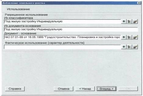 Пустое поле из документа-основания автоматически заполняется содержимым поля Из классификатора. Значение поле из документа основания доступно для последующего редактирования с клавиатуры. Это поле заполняется в случае несоответствия формулировки разрешенного использования земельного участка, приведенной в документе-основании, с элементами классификатора. В печатные формы попадает значение именно этого поля.