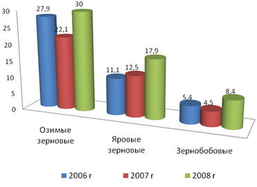 Рис 2 - Уровень урожайности зерновых культур в 2006 - 2008 гг