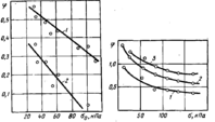 Рис. 4.5 – Экспериментальные зависимости коэффициента сцепления (а, в) и трения (б) от давления на почву: 1, 2 – торф с разной влажностью; 3, 4 – соответственно плотный и рыхлый песок; 5 – глина; 6 – болото; 7 – луг; 8 – глина; 9 – рыхлый песок (сплошная линия на рис. 4.6), а в зоне низких давлений коэффициент сцепления уменьшается (пунктирная линия на рис. 4.6).