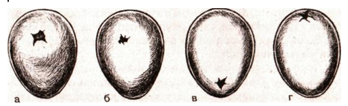 Рис. 3 Наклев скорлупы перед выводом: А - нормальный; б - очень мелкий; в - наклев в остром конце яйца; г - наклев в тупом конце яйца
