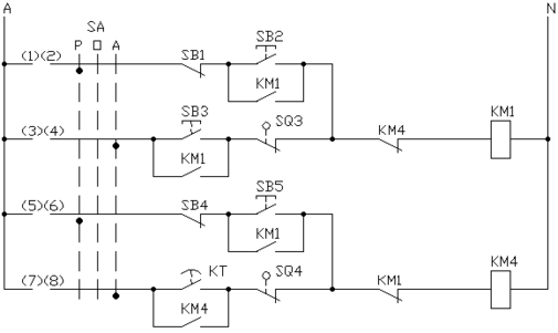 При помощи автоматического выключателя QF1 подаем напряжение на схему управления. Рассмотрим работу схемы в автоматическом режиме, для чего автоматический переключатель SA ставим в положение А. Линию в работу включает оператор кнопочной станцией при помощи кнопки SB3, в результате чего получает питание магнитный пускатель КМ1, замыкаются его контакты КМ1.2 (осуществляем шунтирование кнопки SВ4), КМ1.3, КМ1.4 (для подготовки к пуску КМ2 и КМ3) и в цепи магнитного пускателя КМ4 размыкается контакт КМ1.5. кормораздатчик по средством запитки КМ2 начинает движение «вперед». При начале движения кормораздатчика конечный выключатель SQ4 возвращается в исходное положение подготавливая КМ4 к пуску. При подходе кормораздатчика к кормушкам, он посредством упора воздействует на конечный выключательSQ1 и через его контакты SQ1.1 и SQ1.2 получают питание магнитные пускатели КМ2 и КМ3, в работу включаются выгрузные шнеки кормораздатчика. В конце кормушки кормораздатчик воздействует через упор на конечный выключатель SQ2 и размыкаются контакты SQ2.1 и SQ2.2, обесточиваются магнитные пускатели КМ2 и КМ3, выгрузные шнеки останавливаются. Освободив кормушку кормораздатчик воздействует упором на конечный выключатель SQ3. В цепи км1 размыкается контакт SQ3.1, КМ1 обесточивается и кормораздатчик останавливается. В цепи реле времени КТ замыкается контакт SQ3.2, в результате чего оно срабатывает и через 2 сек. запитывает через свой контакт КТ, магнитный пускатель КМ4, осуществляющего привод движения кормораздатчика «назад». Контакт реле времени КТ шунтируется замыкающим контактом КМ4.2, и катушка реле времени обесточивается, т. к. размыкается контакт КМ4.3. В цепи КМ1 размыкается контакт электрической блокировки КМ4.4. По возвращении кормораздатчика в исходное состояние он упором воздействует на конечный выключатель SQ4, в результате чего обесточивается КМ4 и кормораздатчик останавливается и вновь готов к работе.