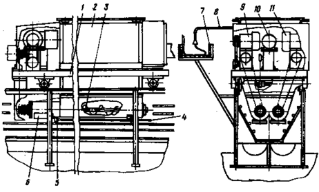 Рисунок 3.1. Технологическая схема мобильного кормораздатчика КЭС–1.7: 1 – тележка; 2 – бункер; 3 – шнек подающий; 4 – рычаг; 5 – заслонка; 6 – выгрузной люк; 7 – лоток; 8 – поводок-кронштейна ввода электропитания; 9,11 – электродвигатели; 10 – электропривод