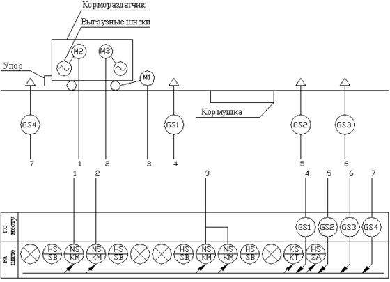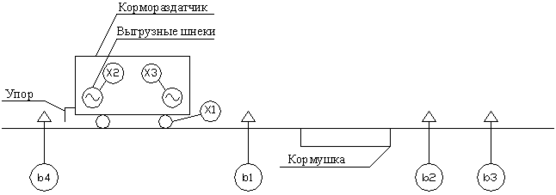 Линию в работу включает оператор при помощи кнопочного поста. Включение контакта кнопочной станции кратковременное, при этом кормораздатчик включается и перемещается к началу кормушек, где он останавливается, двигатель привода движения реверсируется, и включаются выгрузные шнеки транспортеров, т.е. происходит раздача корма. В конце кормушек выгрузные шнеки останавливаются. Через некоторое время включается реверс привода движения кормораздатчика, и он возвращается в исходное положение.