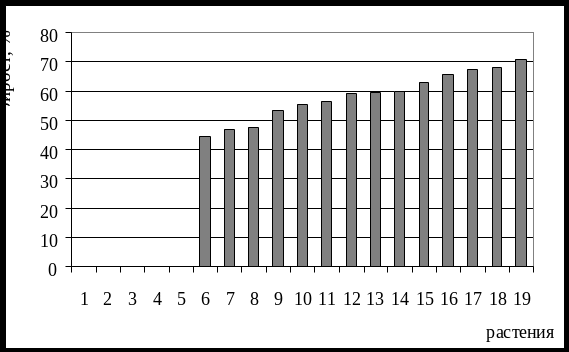 Средний прирост черенков декоративных многолетних лиан за время наблюдений в процентах от исходного размера представлены на рисунке 2.