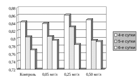 Как видно из представленных данных, при первом измерении (на 4-е сутки) четко прослеживается увеличение весового коэффициента в концентрациях 0,25 и 0,50 мг/л. На 5-е сутки только в опыте, где концентрация гербицида составляла 0,25 мг/л, коэффициент был выше, чем в контроле. При концентрации 0,50 мг/л произошло снижение анализируемого показателя. Для концентрации 0,05 мг/л весовой коэффициент как на 4-е, так и на 5-е сутки от аналогичной величины в контроле практически не отличался. На 6-е сутки нами было зафиксировано увеличение весового коэффициента по отношению к контролю во всех вариантах опыта.