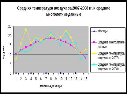 Как видно из рисунка 1, наибольшая температура наблюдалась в 2007 году в третье декаде мая и во второй декаде августа, а в 2008 году во второй декаде июня и второй декаде августа, т. е. пики смещены на начало и конец вегетационного периода.