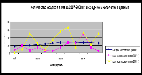 Делая вывод о погодных условиях за годы проведения опытов, следует подчеркнуть, что они отличаются: 2007 год имеет четыре пика температуры, которые приходятся на каждый месяц вегетации: май (третья декада), июнь (вторая декада), июль (вторая декада) и август (вторая декада), при этом количество осадков, за исключением второй декады мая и первой декады августа было всегда ниже нормы, лишь во второй и третьей декаде июля количество выпавших осадков приблизилось к среднемноголетнему значению.