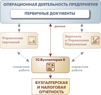 "1С: Бухгалтерия 8.0" обеспечивает решение всех задач, стоящих перед бухгалтерской службой предприятия, если бухгалтерская служба полностью отвечает за учет на предприятии, включая, например, выписку первичных документов, учет продаж и т.д. Кроме того, информацию об отдельных видах деятельности, торговых и производственных операциях, могут вводить сотрудники смежных служб предприятия, не являющиеся бухгалтерами. В последнем случае за бухгалтерской службой остается методическое руководство и контроль за настройками информационной базы, обеспечивающими автоматическое отражение документов в бухгалтерском и налоговом учете.