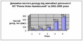 Що ж стосується чистого доходу від звичайної діяльності, то даний показник за аналізований період мав теж мінливий характер: за 2001-2002 роки він збільшився на 56,8 тис грн, у 2003 році - на 80,5 тис. грн, в 2004 році - зріс на 302,1 тис. грн, в 2005 – на 261,5 тис. грн. Загалом чистий дохід від звичайної діяльності за період з 2001 по 2005 роки збільшився на 700,9 тис. грн чи майже в 131 раз.