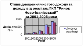 Співвідношення чистого доходу та доходу від реалізації відображено на малюнку 3.1.2., який дає змогу визначити, що це співвідношення має нестабільний характер. До 2004 року різниця між цими категоріями постійно зростала, а в 2005 році трохи зменшилась.