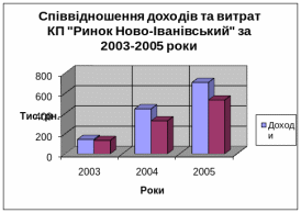 Як вже було сказано раніше, встановлення співвідношення доходів і витрат дає змогу визначити фінансовий результат підприємства. Згідно даних, відображених на малюнку 3.1.3., доходи комунального підприємства “Ринок Ново-Іванівський” за період з 2003 по 2005 роки з кожним роком все більше перевищували витрати діяльності, тобто це дає змогу стверджувати, що підприємство отримувало прибуток, який мав тенденцію до збільшення.