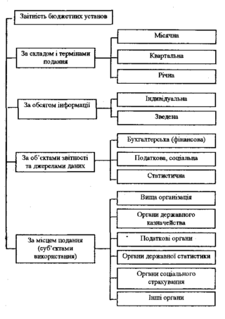 Для загального уявлення про склад звітності бюджетних установ розглянемо її класифікацію за складом та суб'єктами використання.
