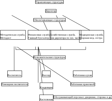 - обеспечивающие структуры управления - главный бухгалтер (организацию бухгалтерского учета и контроля за рациональным, экономным использованием материальных, трудовых и финансовых ресурсов), заместитель директора по административно-хозяйственной части (создание материально-технических условий, контроль за деятельностью исполнительских структур), методист (реализация требовании к организации учебно-воспитательного процесса) и старшая медицинская сестра (контроль за соблюдением санитарно-гигиенических норм);