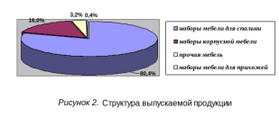 Основным видом выпускаемой продукции является производство наборов мебели для спальни, удельный вес которых в общем объеме производства составляет 80,4%. Структура выпускаемой продукции представлена в виде круговой диаграммы (рис.2).