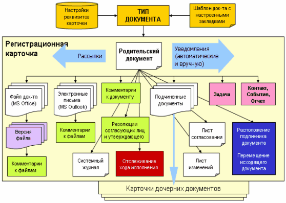 Если документ имеет подчиненные документы, то для каждого подчиненного документа заводится отдельная карточка, соответствующая его типу. В карточке подчиненного документа указывается индекс родительского документа. При просмотре карточки родительского документа система выдает список всех подчиненных документов с гиперссылками на карточки этих документов.