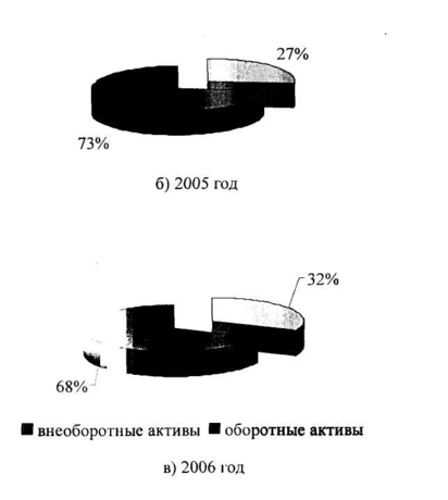 К концу 2005 года удельный вес внеоборотных активов уменьшился па 10% по сравнению с 2004 годом, и составил 26,9%, а удельный вес оборотных увеличился на 10% и составил 73,1%. Что касается 2006 года, то к концу года удельный вес внеоборотных активов увеличился на 4,7% и составил 31,6%, а удельный вес оборотных активов уменьшился на 5,3% и составил 68,4% в сумме активов.