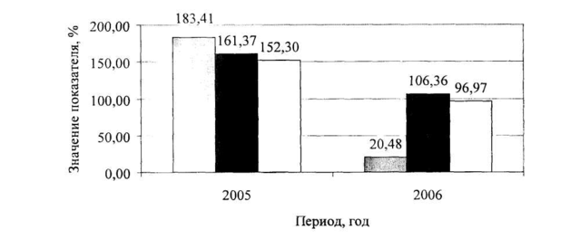 Для данной организации темп роста активов за 2005 год составил 152%, объема продаж (выручки) - 161%, прибыли - 183%, то есть данное условие выполнено: 100% < 183% < 161% < 152%.