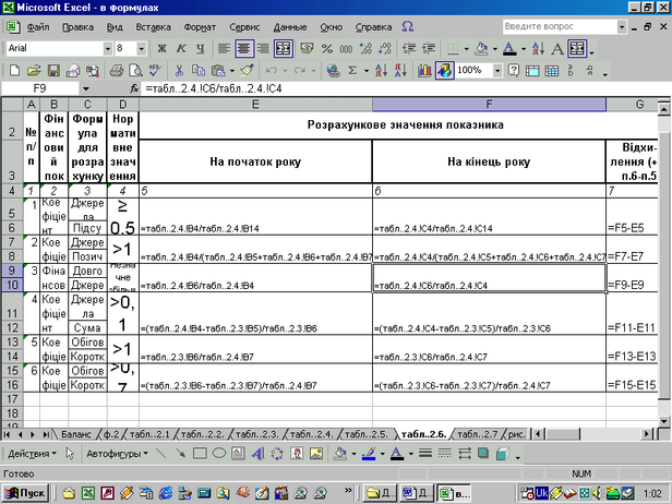 | №п/п | Фінансовий показник (коефіцієнт) | Формула для розрахунку | Нормативне значення | Розрахункове значення показника | ||