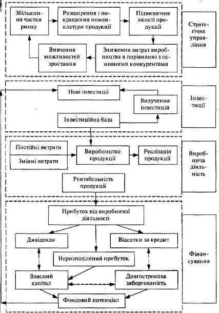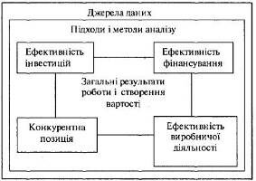 На рис.1.1 зображена загальна схема потоків, яка містить всі основні елементи, необхідні для розуміння загальної схеми фондових потоків типового бізнесу [27]. Прямокутники і стрілки показують закриту систему, всі частини якої взаємопов'язані. Система включає чотири сегменти, які відповідають чотирьом основним сферам прийняття рішень: стратегічному аналізу, інвестиціям, виробничій діяльності і фінансуванню. Основним завданням економічного аналізу є побудова розумного послідовного набору даних і вибір тих показників, які можна було б ефективно використовувати у відповідних підходах і методах аналізу. Якщо це зроблено добре, то використання певних підходів і методів дає змогу менеджеру і аналітику судити про оцінку того чи іншого рішення, про фінансовий стан, про ефективність діяльності і планах на майбутнє бізнесу в категоріях фінансових та економічних результатів і вартості. Наявність чотирьох відокремлених сегментів прийняття управлінських рішень обумовлює існування чотирьох видів аналізу [28]: стратегічний аналіз, аналіз інвестицій, аналіз виробничої діяльності та фінансовий аналіз (рис.1.2).