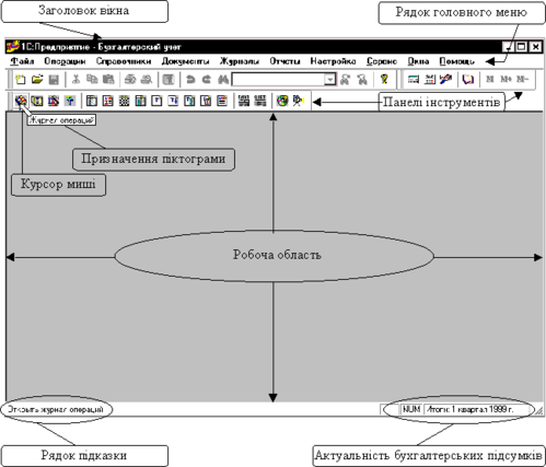 Меню в програмі “1С:Бухгалтерия 7.5” – багаторівневе. Перший рівень меню називають головним меню. Головне меню розташоване у верхній частині головного робочого вікна і є рядком, що містить перелік пунктів меню. Кожний пункт головного меню є назвою групи режимів або функцій програми. У головне меню можна увійти за допомогою клавіатури (клавіші або ). Після цього перший пункт меню Файл буде виділений кольором. Маніпулювання клавішами стрілок і призведе до переміщення виділення кольором від одного пункту меню до іншого. Вибір необхідного пункту здійснюється натисканням клавіші . Тоді на екрані з'являється (“випадає”) залежне підменю, що розкриває перелік функцій, які входять в обрану групу. На рис. 4 показаний момент, коли в головному меню обраний пункт Документы, якому відповідає підменю, що містить перелік доступних документів. Якщо пункт у підменю не є кінцевим, то праворуч від його назви є значок, який свідчить про наявність наступного рівня. Наприклад, вибір пункту Документы із головного меню призведе до розгортання підменю, яке містить декілька пунктів, причому праворуч пункту Регламентные розташований значок, який говорить про те, що даний пункт не є кінцевим, він має підпункти. Отже, натискання клавіші на такому пункті меню призведе до розгортання чергового підменю. Розгортаючи послідовно підпорядковані рівні меню, на якомусь етапі досягаємо кінцевого пункту, що реалізує деяку дію.