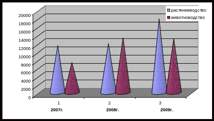 Так, за период 2007–2009 гг. на долю зерновых приходится в среднем 40,0%, на долю скота, проданного в живом весе 11,4%, молока – 43,1%.