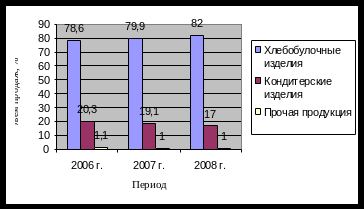 Очевидно, что объем продаж выпускаемой продукции в денежном выражении за 3 последних года увеличился с 341 486 тыс. руб. до 459 695 тыс. руб., соответственно увеличился и объем производства продукции. Причем наблюдается тенденция увеличения объемов продаж хлебобулочных изделий, одновременно доля кондитерских изделий сократилась на 2,1 % в результате снижения спроса.