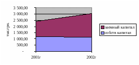 На анализируемом предприятии за рассматриваемый период общая сумма собственных и заемных капиталов увеличилась, однако основным источником формирования имущества является заемный капитал. В 2001 году его доля в структуре пассивов составляла 51,98 %. В 2002 году доля заемного капитала в структуре пассивов увеличилась на 10,7 % и составила 62,68 %, а доля собственного капитала соответственно снизилась и составляет всего 37,32 %, что свидетельствует о повышении степени финансовой зависимости предприятия от внешних инвесторов и кредиторов. Такая структура источников формирования имущества предприятия является признаком финансовой неустойчивости предприятия. Следующий шаг - анализ динамики и структуры заемного капитала, т.е. соотношения долгосрочных и краткосрочных обязательств. На первом этапе анализа изучается динамика общего объема привлечения заемных средств за ряд предшествующих периодов. В рассматриваемом отчетном периоде обязательства предприятия на 100% состояли из текущих, что является негативным фактором, свидетельствующим о нерациональной структуре баланса и о высоком риске потери финансовой устойчивости.