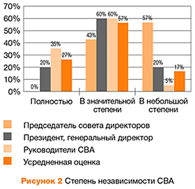 Около двух третей руководителей СВА российских предприятий подчинены высшему исполнительному руководству (президенту, генеральному директору или финансовому директору) и лишь 37% подотчетны совету директоров компании.
