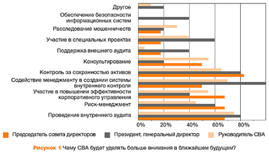В то время как высшее исполнительное руководство в качестве первоочередных задач внутреннего аудита в будущем видит содействие менеджменту в построении системы внутреннего контроля (100%) и участие в специальных проектах (60%), советы директоров ожидают от аудиторов участия в риск-менеджменте (67%) и повышения эффективности корпоративного управления (67%). Сами руководители СВА считают приоритетными проведение внутреннего аудита (75%) и содействие менеджменту в построении системы внутреннего контроля (70%). В числе наиболее приоритетных задач все три группы отметили контроль над сохранностью активов.