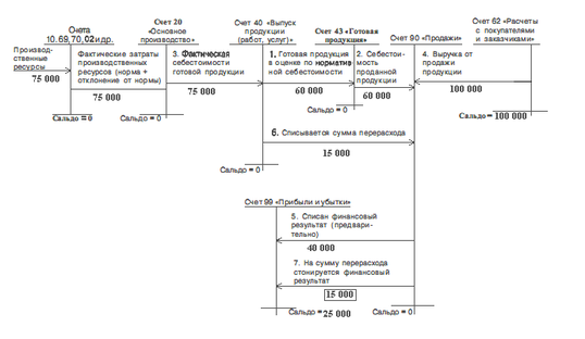 Рисунок 3 - Схема бухгалтерских записей при использовании нормативного метода учета затрат и калькулирования (перерасход)