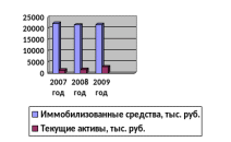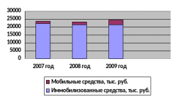Доля иммобилизованных средств в 2007 году составила 94%, в 2008 году – 93%, в 2009 году – 88%. Вместе с тем наблюдается суммарное снижение части иммобилизованных средств в 2008 году по сравнению с 2007 (на 664 тыс. руб.) и последующее ее увеличение в году 2009 до 21618 тыс. руб.